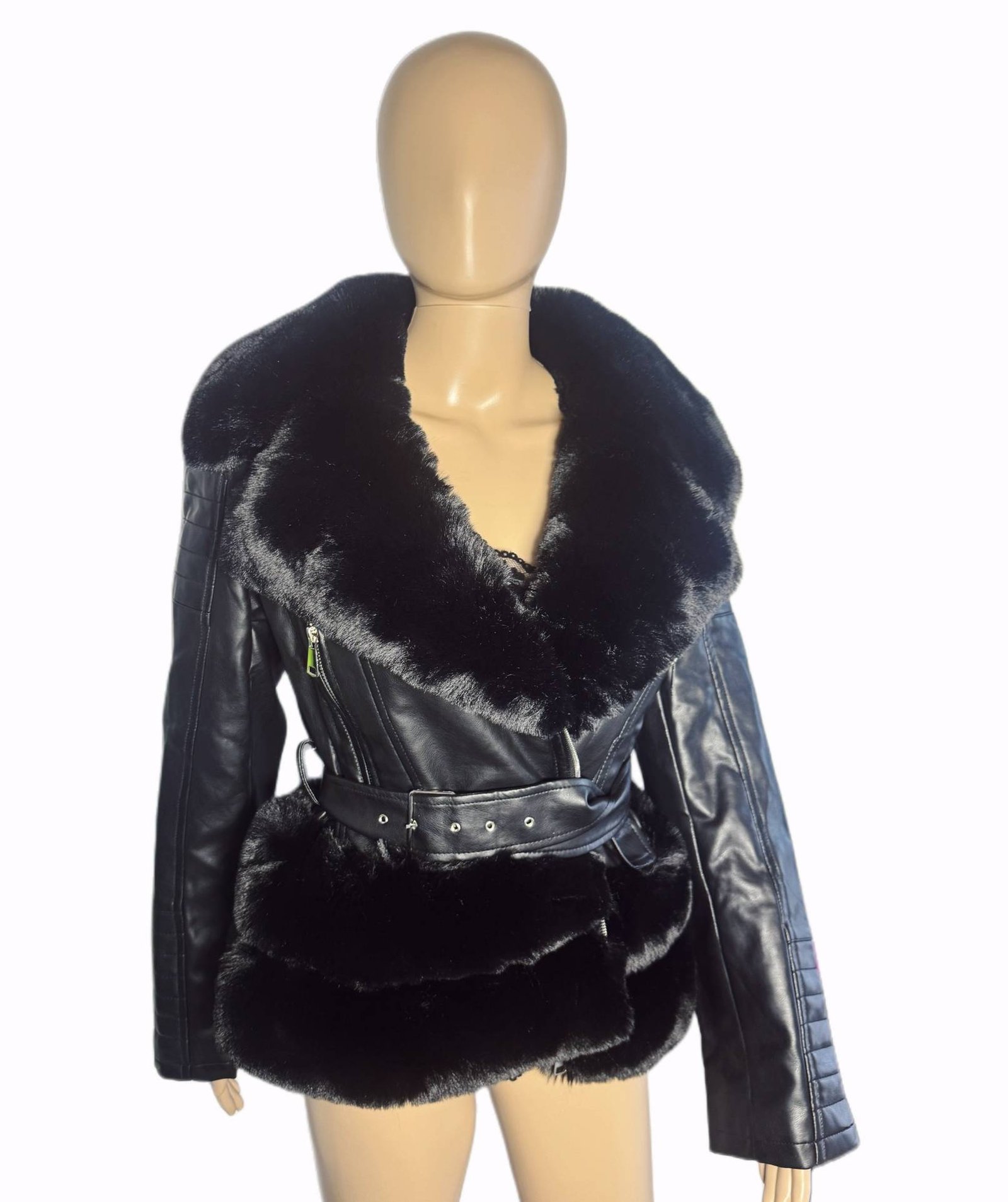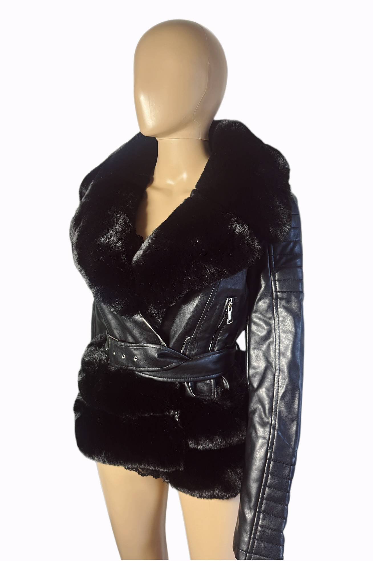 - Kožený vzhľad biker bunda s vyraznym kožušinovým golierom, hrejivou podšívkou