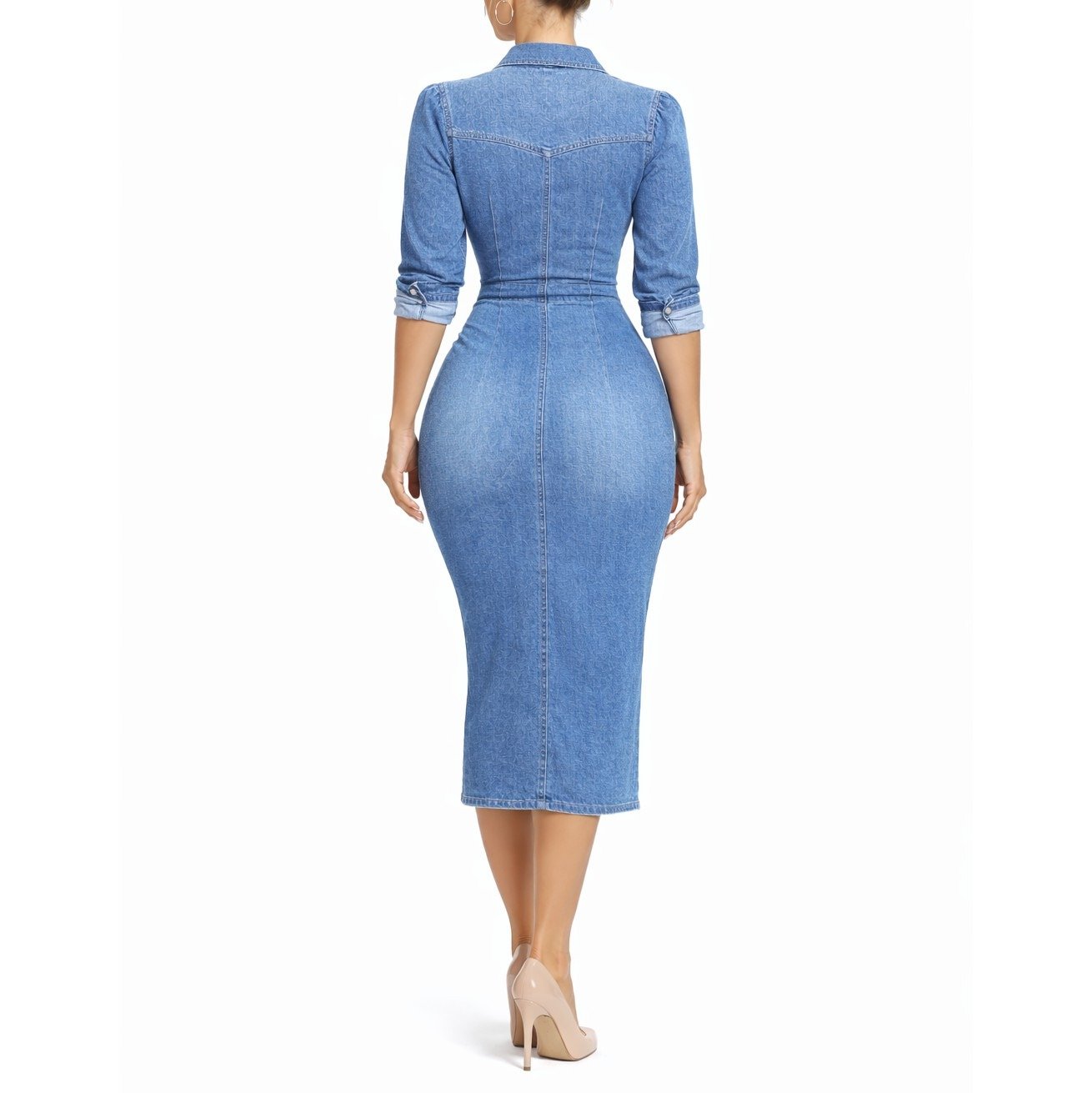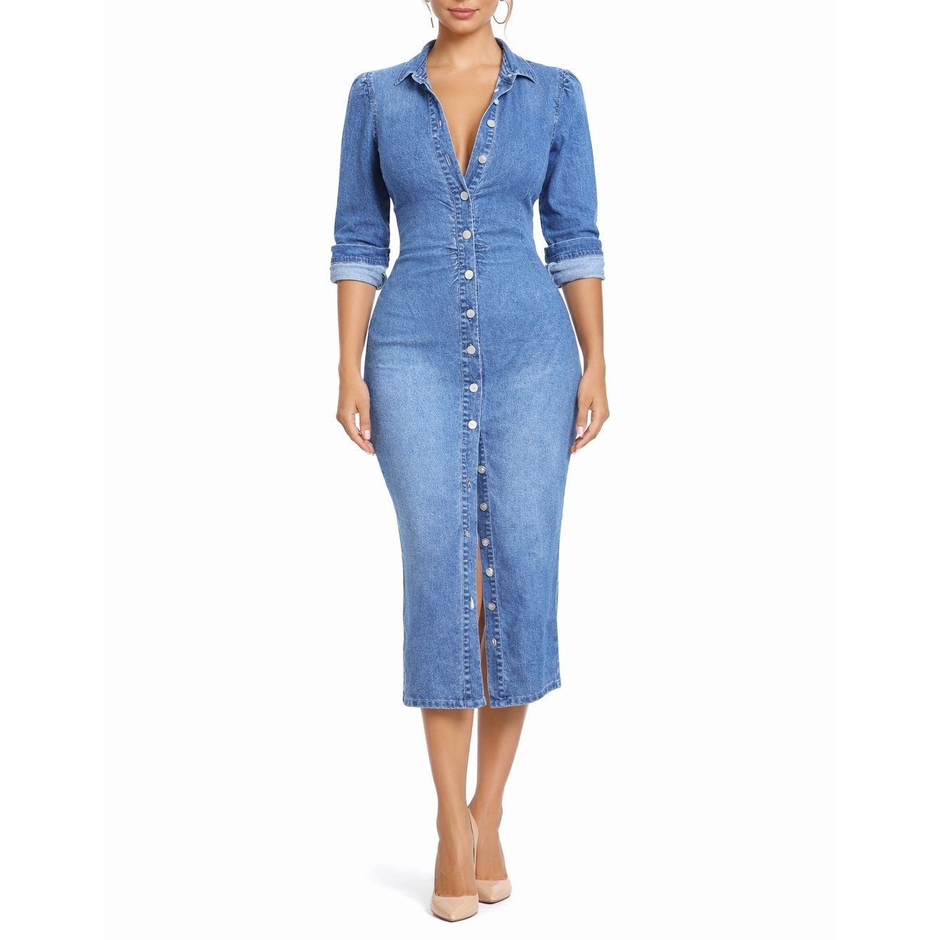 - Tieto priliehavé džínsové košeľové šaty s midi dĺžkou a efektnými 3/4 rukávmi sú ideálnou voľbou pre modernú ženu.
